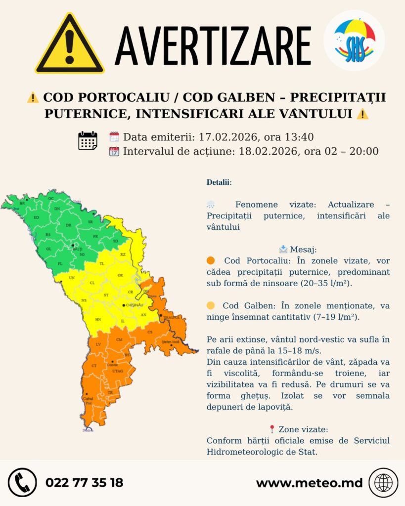 Serviciul Hidrometeorologic de Stat (SHS) a actualizat astăzi codul portocaliu și cel galben de precipitații puternice și vânt intens. Noua avertizarea va fi valabilă miercuri, 18 februarie, între orele 02.00 – 20.00.