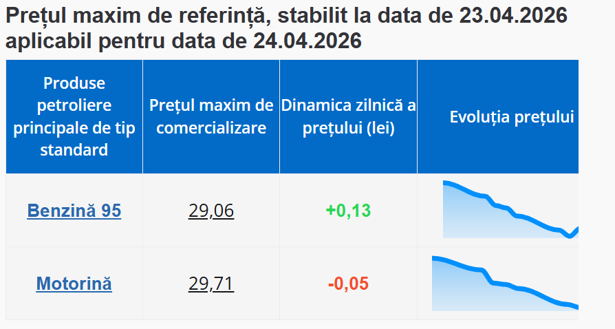 Agenția Națională pentru Reglementare în Energetică (ANRE) a afișat noile prețuri la carburanți pentru vineri, 24 aprilie.