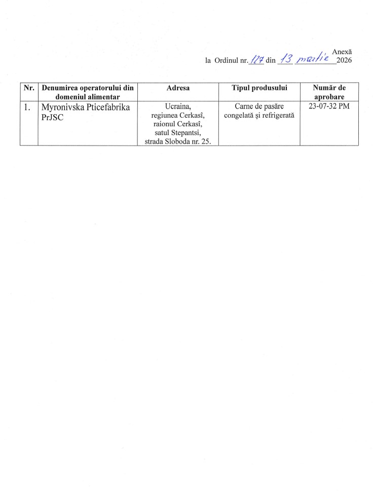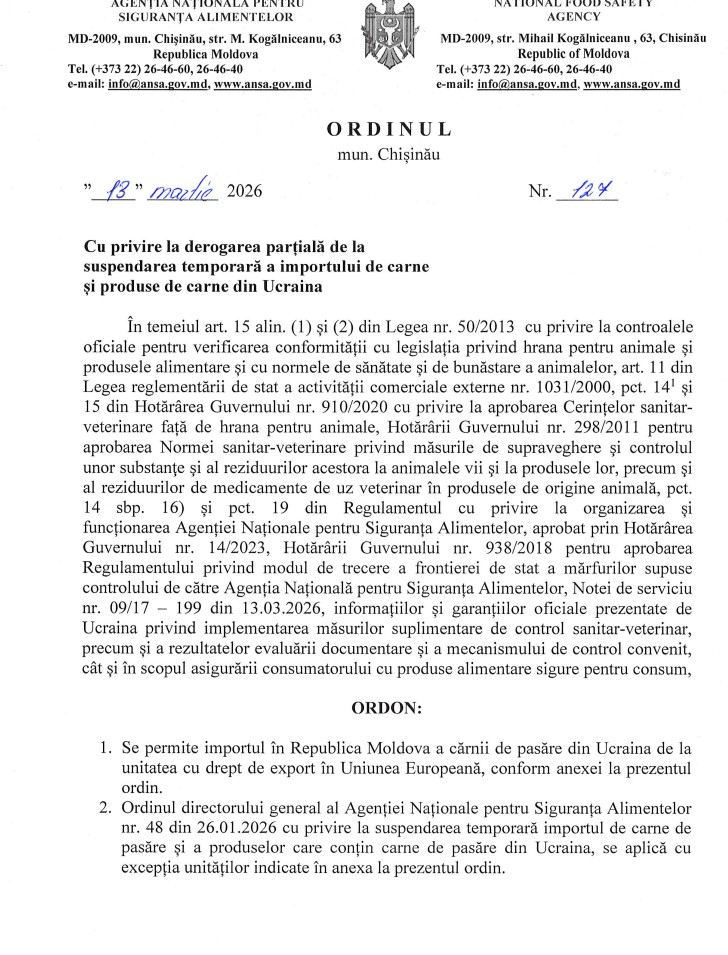 „La 13 martie a fost aprobat ordinul de a permite importul de carne de pasăre eviscerată din Ucraina doar de la o singură unitate, care are drept de export în UE și care ia toate măsurile prevăzute de înțelegerea din 4 martie dintre autoritățile din Ucraina și R. Moldova”, a declarat Mariana Gratii.