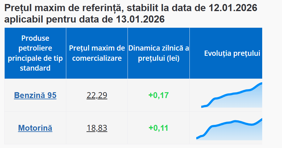 Menționăm că în ultima lună a anului trecut prețurile la carburanți au scăzut constant, atingând înainte de Crăciun pe stil nou cele mai mici valori din ultimii patru ani. Totuși, începând cu primele zile ale anului 2026, acestea au început să înregistreze o ușoară creștere.
