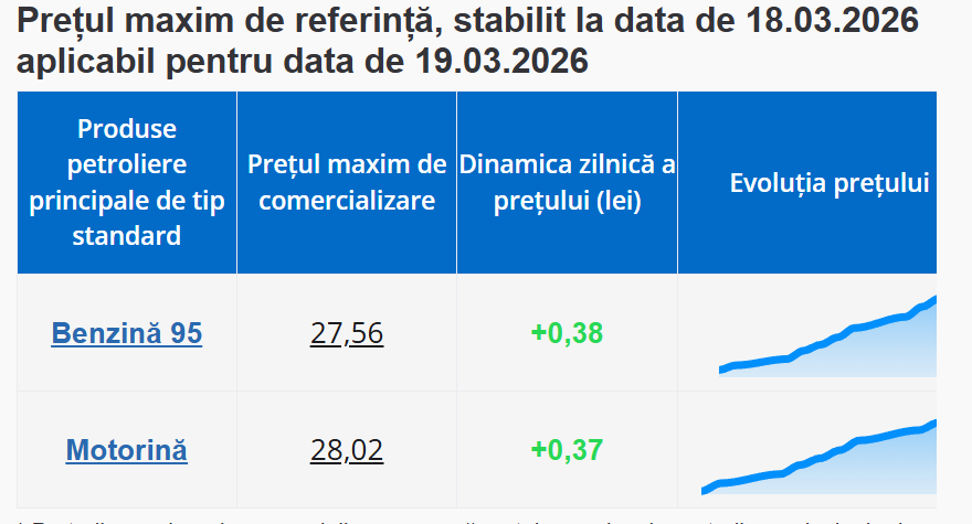 Astfel, litrul de benzină va costa 27,56 lei, cu 38 de bani mai mult decât astăzi. Totodată, motorina se va scumpi cu 37 de bani, urmând a fi comercializată cu prețul de 28,02 lei/litru.