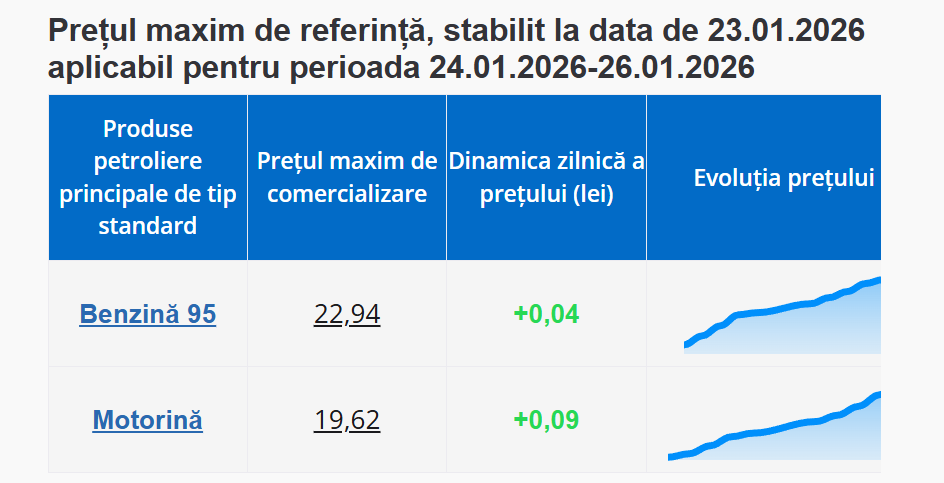 Astfel, conform datelor publicate de Agenția Națională pentru Reglementare în Energetică, în perioada 24-26 ianuarie, litrul de benzină va costa 22,94 lei, cu 4 bani mai mult decât astăzi. De asemenea, prețul motorinei va crește cu 9 bani, ajungând la 19, 62 lei/litru.