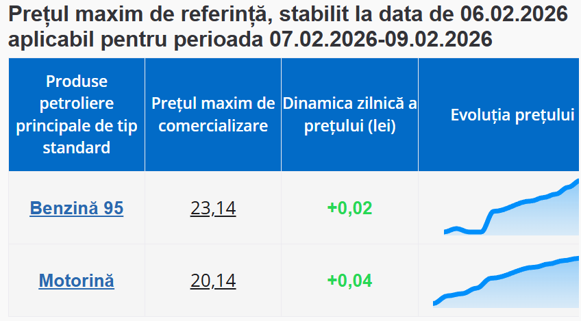 Conform datelor publicate de Agenția Națională pentru Reglementare în Energetică, în perioada 7 – 9 februarie, litrul de benzină va costa 23,14 lei, cu 2 bani mai mult decât astăzi. De asemenea, prețul motorinei va crește cu 4 bani, ajungând la 20,14 lei/litru.