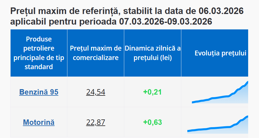 Conform datelor publicate de Agenția Națională pentru Reglementare în Energetică, în perioada 7 – 9 martie, litrul de benzină va costa 24,54 lei, cu 21 de bani mai mult decât astăzi. Totodată, prețul motorinei va crește cu 63 de bani, ajungând la 22,87 lei/litru.