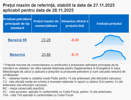 Astfel, litrul de benzină va costa 23,28 lei, cu 3 bani mai puțin decât astăzi. Totodată, prețul motorinei va scădea cu 11 bani, ajungând la 20,88 lei/litru.