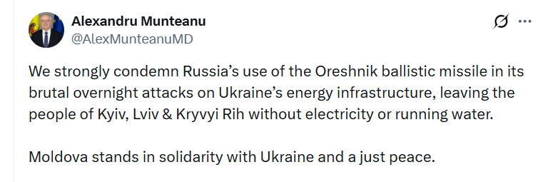 Condamnăm cu fermitate utilizarea de către Rusia a rachetei balistice Oreșnik în atacurile sale brutale din cursul nopții asupra infrastructurii energetice a Ucrainei, care au lăsat locuitorii din Kiev, Liov și Krivoi Rog fără electricitate și apă curentă. Moldova este solidară cu Ucraina și cu o pace justă”, a transmis Alexandru Munteanu.