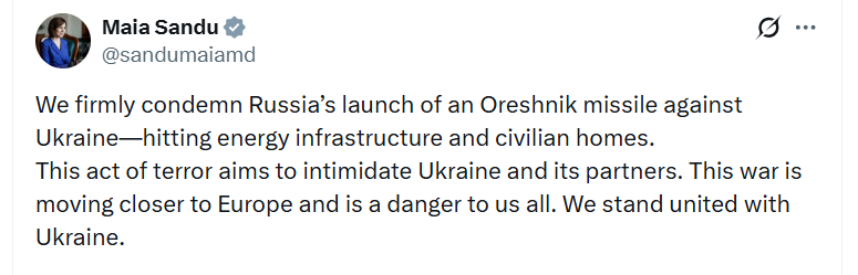 „Condamnăm ferm lansarea de către Rusia a unei rachete Oreșnik împotriva Ucrainei, care a lovit infrastructura energetică și locuințe civile. Acest act de teroare urmărește să intimideze Ucraina și partenerii săi. Acest război se apropie tot mai mult de Europa și reprezintă un pericol pentru noi toți. Suntem uniți alături de Ucraina”, a scris Maia Sandu pe platforma X.