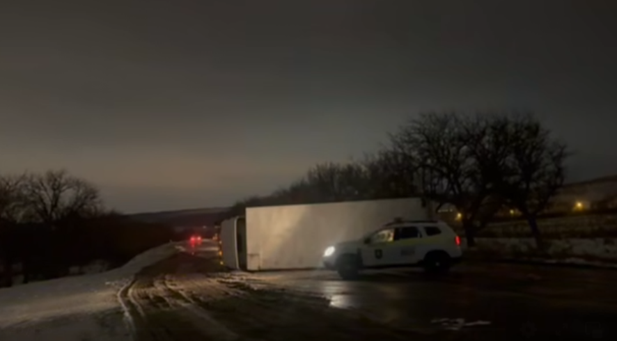 Potrivit Poliției, un camion, condus de un bărbat a cărui identitate urmează a fi stabilită, a derapat de pe carosabil, s-a răsturnat și a blocat complet traseul.