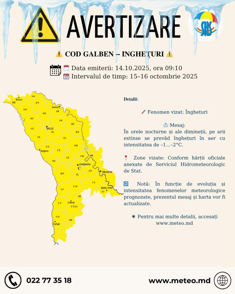 Serviciul Hidrometeorologic de Stat a emis cod galben de înghețuri pe întreg teritoriul Republicii Moldova. Avertizarea este valabilă pentru zilele de 15 și 16 octombrie.