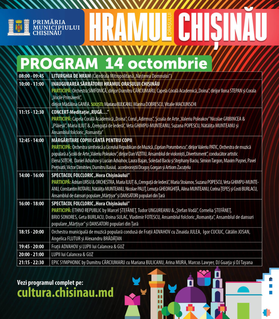 Hramul orașului Chișinău va fi sărbătorit marți, 14 octombrie, printr-un amplu program de activități religioase și artistice, organizate în Piața Marii Adunări Naționale.
