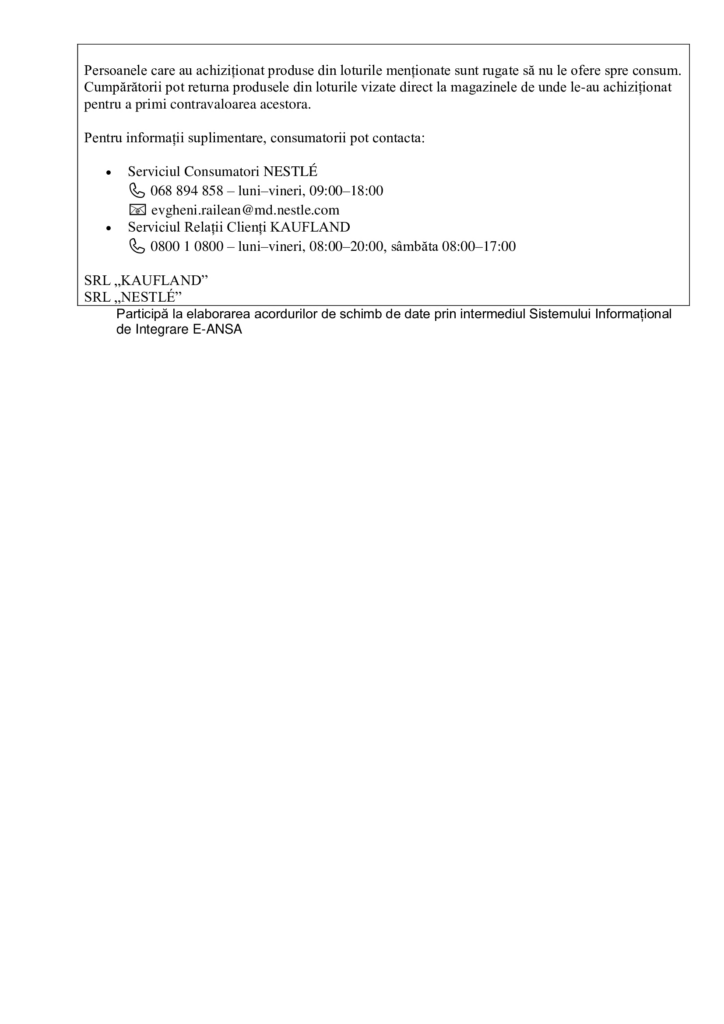 📧 evgheni.railean@md.nestle.com - Serviciul Relații Clienți KAUFLAND – 📞 0800 1 0800 (luni–vineri, 08:00–20:00; sâmbăta, 08:00–17:00)
