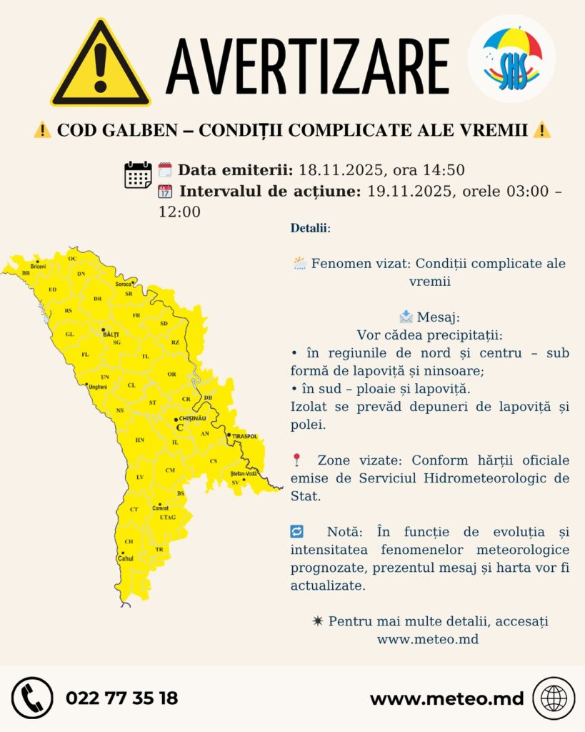 Serviciul Hidrometeorologic de Stat a emis cod galben de condiții complicate ale vremii. Avertizarea este valabilă mâine, 19 noiembrie, între orele 03:00-12:00