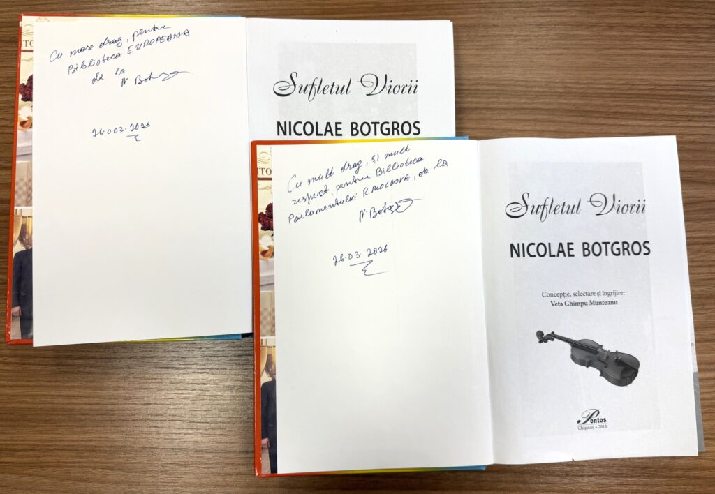Maestrul Nicolae Botgros le-a oferit colegilor deputați câte un exemplar al volumului „Sufletul viorii”, însoțit de un autograf, la plecarea sa din Parlament.