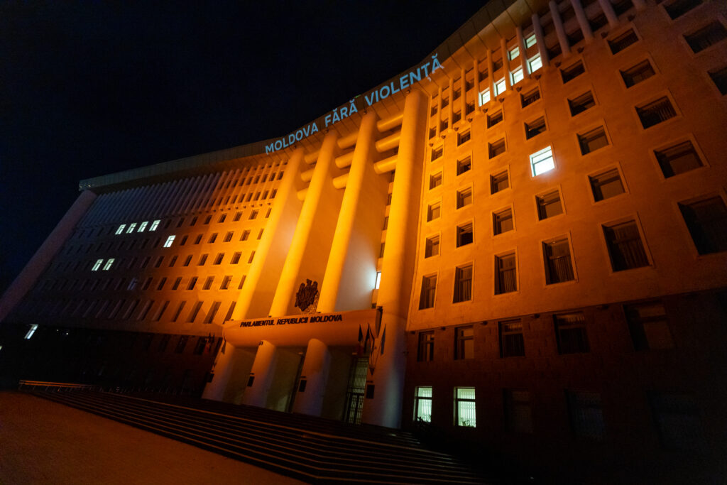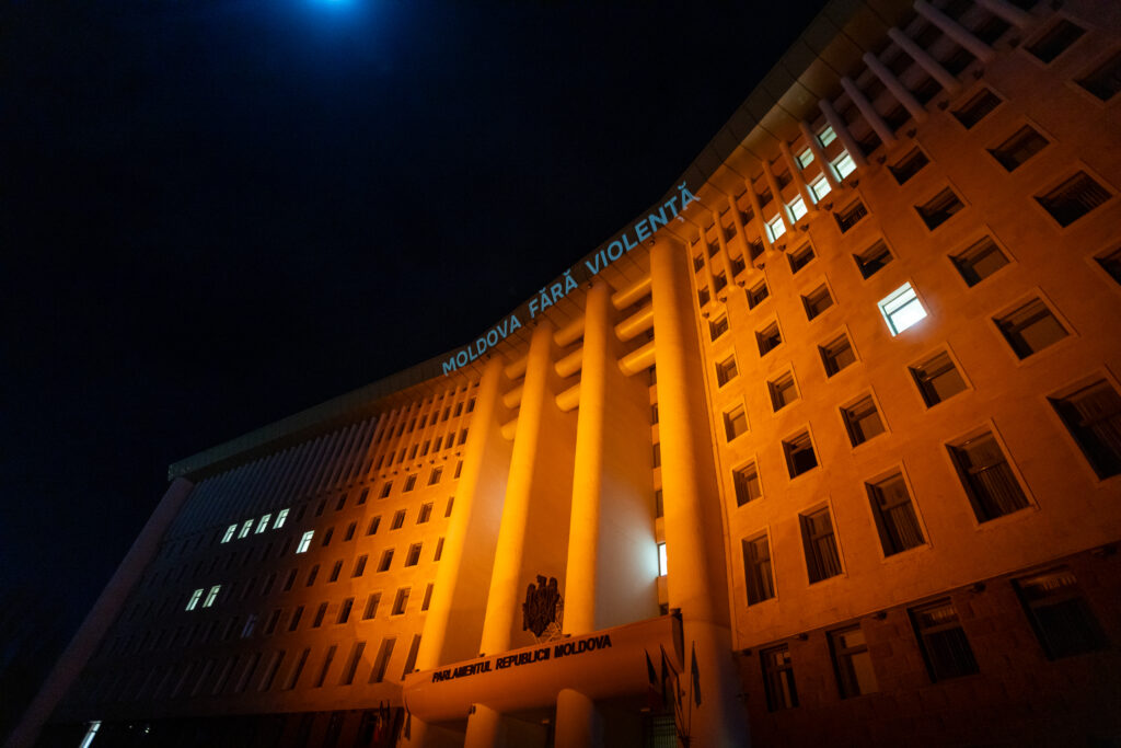 Clădirea Parlamentului Republicii Moldova a fost iluminată în această seară în oranj, culoare utilizată la nivel internațional ca simbol al luptei împotriva violenței asupra femeilor.