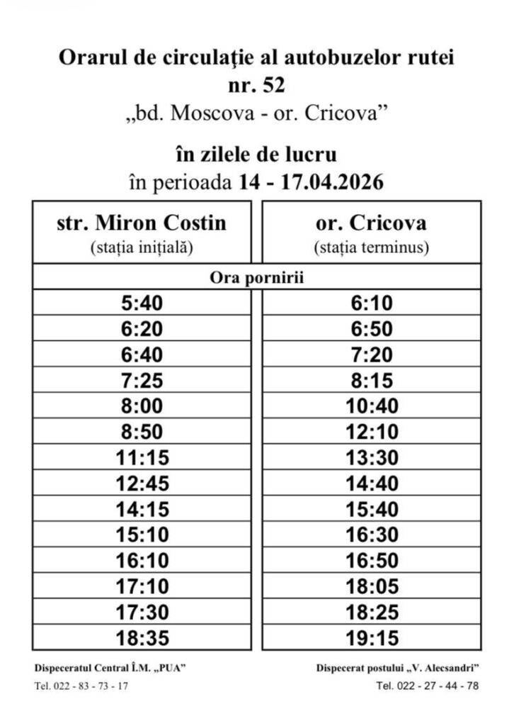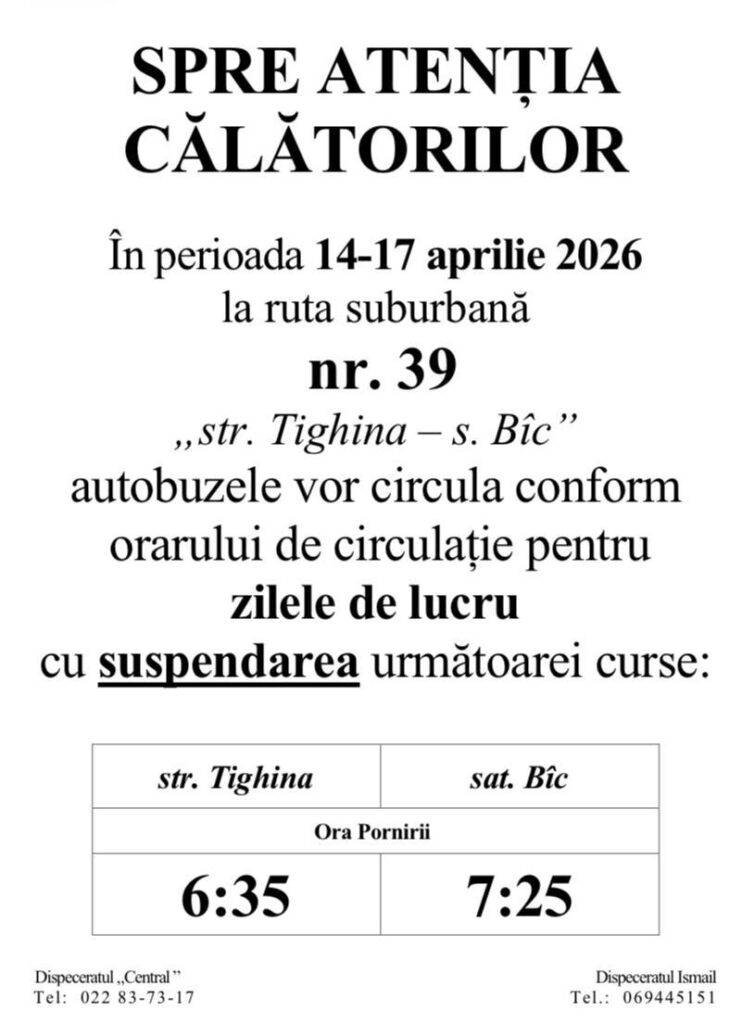 În acest context, călătorii sunt îndemnați să consulte din timp orarele actualizate sau să solicite informații suplimentare la dispeceratul Parcului Urban de Autobuze, la numărul de telefon 022 837 317.