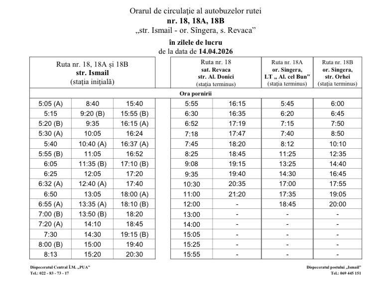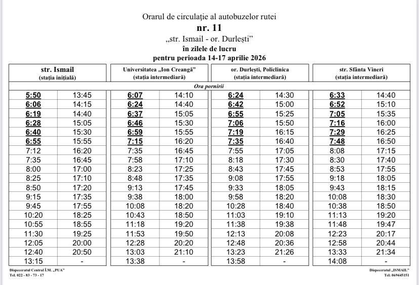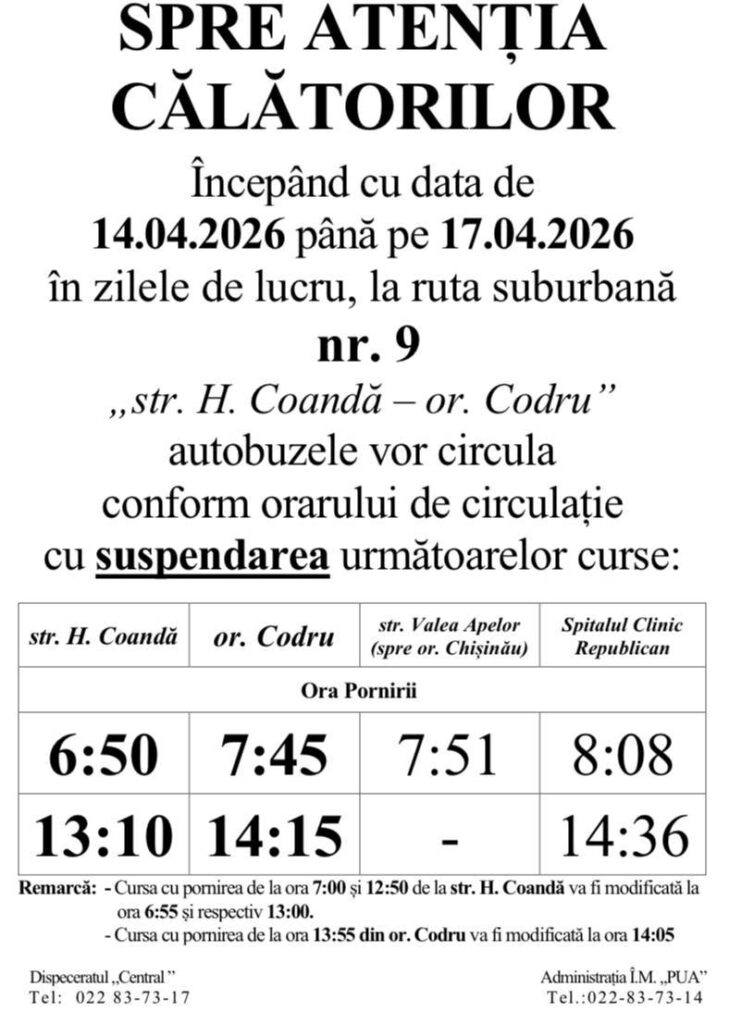 Astfel, în perioada 14–17 aprilie, vor fi operate modificări în orarul de circulație a rutelor de autobuz nr. 9, 11, 39 și 52. Totodată, începând de marți, 14 aprilie, vor interveni schimbări și pentru rutele 18, 18A și 18B.