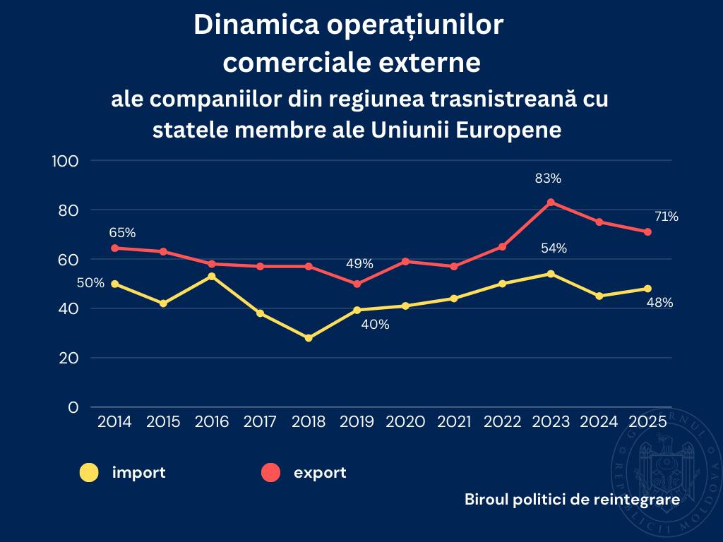 Adaptarea lanțurilor logistice a favorizat o reorientare accentuată a comerțului din regiunea transnistreană către Uniunea Europeană, contribuind totodată la consolidarea conexiunilor economice dintre cele două maluri ale Nistrului și la aplicarea uniformă a standardelor și procedurilor comerciale pe întreg teritoriul Republicii Moldova. Evoluțiile recente confirmă orientarea durabilă a regiunii transnistrene către piața Uniunii Europene, consolidând interacțiunea economică dintre cele două maluri ale Nistrului și contribuind la procesul de reintegrare economică a Republicii Moldova în spațiul european”, a menționat Biroul politici de reintegrare.