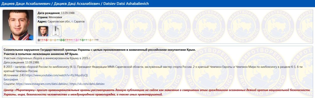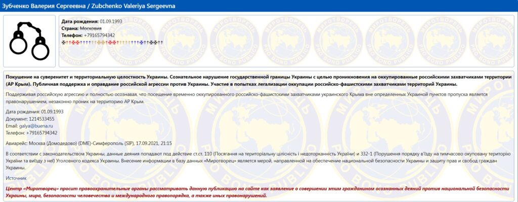 Valeria Zubcenko și Dați Dațiev sunt incluși în baza de date ale site-ului Mirotvoreț. Zubcenko este acuzată de tentativa de încălcare a suveranității și integrității teritoriale ale Ucrainei și justificarea agresiunii ruse împotriva Ucrainei, iar Dațiev – de încălcarea deliberată a frontierei de stat a Ucrainei și tentativa de legitimare a anexării de către Rusia a Crimeei.