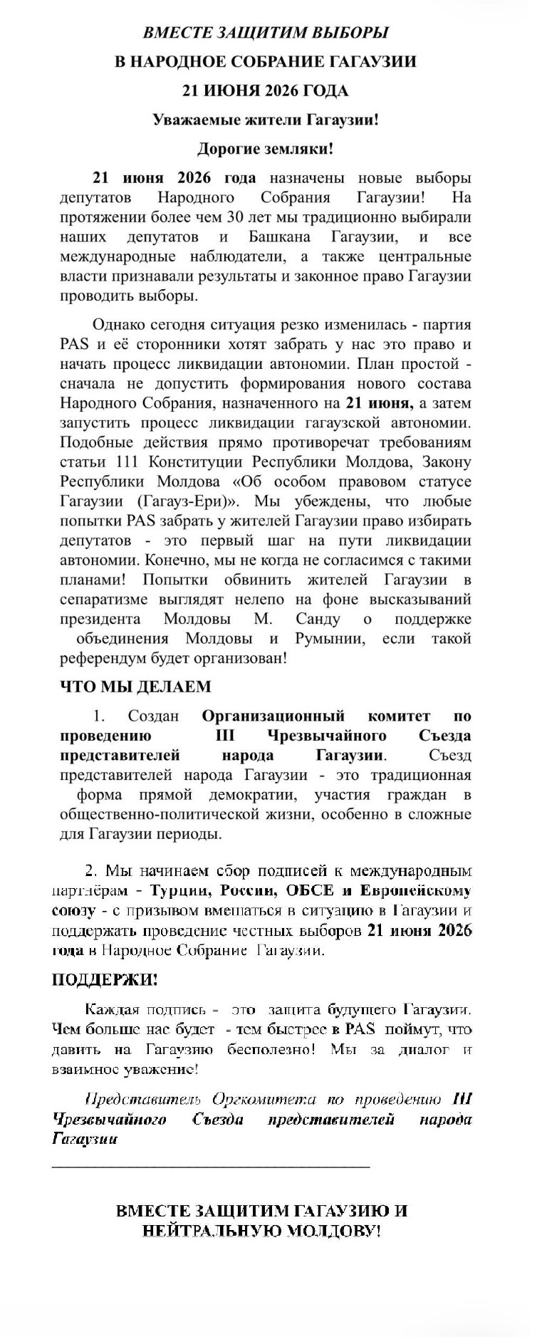 Inițiatorii campaniei promovează acțiunea drept o inițiativă colectivă menită să atragă atenția comunității internaționale asupra situației din regiune. Pliantele distribuite conțin mesaje ce fac apel la sprijin extern și la implicarea partenerilor internaționali în evaluarea evoluțiilor politice din autonomia găgăuză.