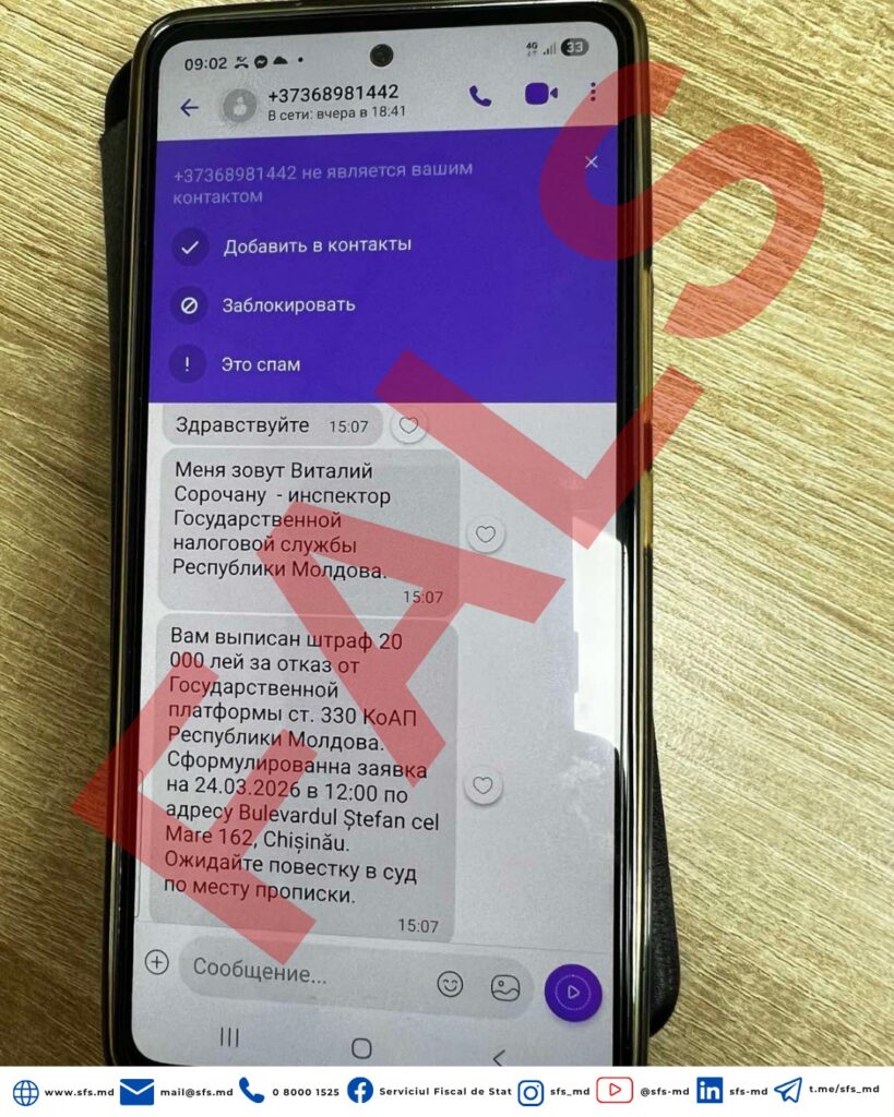 Potrivit sursei citate, persoane necunoscute folosesc ilegal identitatea SFS și se prezintă drept angajați ai autorității fiscale, informând destinatarii că ar fi fost sancționați cu amenzi de până la 20.000 de lei. Mesajele fac trimitere la prevederi legale neclare și indică adrese care nu aparțin subdiviziunilor oficiale ale SFS. Totodată, contribuabilii sunt informați că urmează să recepționeze o cerere de chemare în judecată, la adresa de domiciliu.