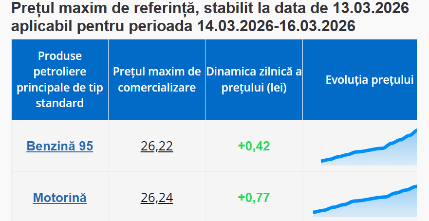 Conform datelor publicate de Agenția Națională pentru Reglementare în Energetică, în perioada 14 – 16 martie, litrul de benzină va costa 26,22 lei, cu 42 de bani mai mult decât astăzi. Totodată, prețul motorinei va crește cu 77 de bani, ajungând la 26,24 lei/litru.