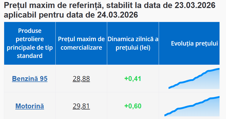 Agenția Națională pentru Reglementare în Energetică (ANRE) a afișat noile prețuri la carburanți pentru marți, 24 martie.