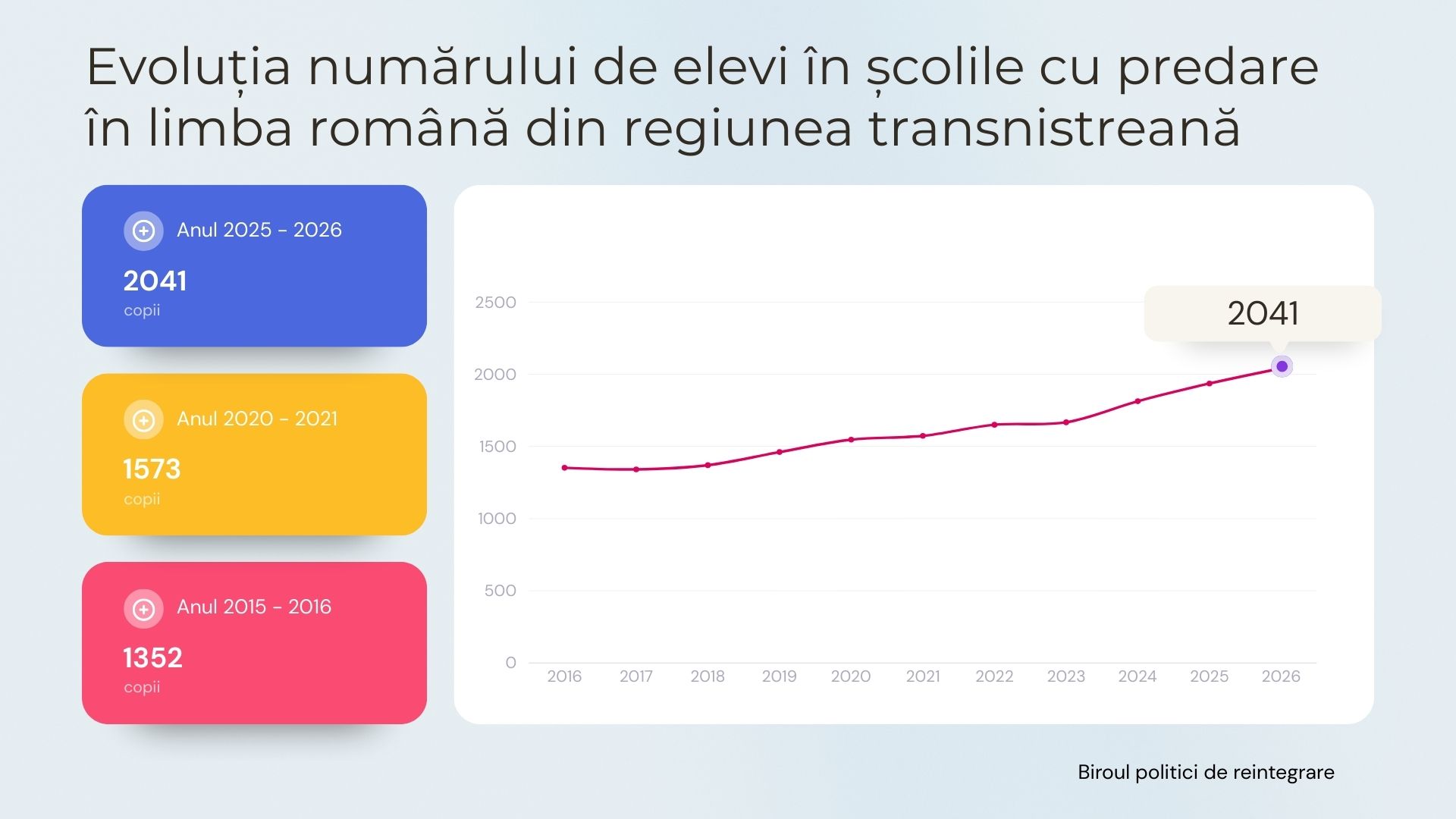 „Această creștere, deși lentă, confirmă faptul că părinții continuă să își orienteze copiii spre instituțiile unde procesul educațional se desfășoară în limba română, cu aplicarea programelor școlare aprobate de Ministerul Educației și Cercetării, care oferă perspective reale de viitor. Totodată, această tendință este și mai valoroasă în contextul general al declinului demografic și al scăderii constante a numărului de copii din întreaga regiune transnistreană a Republicii Moldova”, a informat instituția.