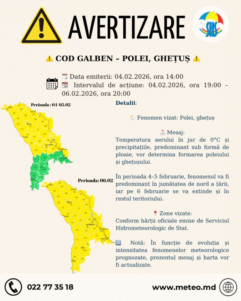 Serviciul Hidrometeorologic de Stat (SHS) anunță cod galben de polei și ghețuș, valabil între 4 februarie, ora 19:00, și 6 februarie, ora 20:00.
