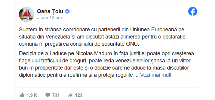„Suntem în strânsă coordonare cu partenerii din Uniunea Europeană pe situaţia din Venezuela şi am discutat astăzi alinierea pentru o declaraţie comună în pregătirea consiliului de securitate ONU. (…) Ne interesează în mod deosebit ce se întâmplă în Venezuela, ţară unde trăieşte o mică, dar relevantă, comunitate cu rădăcini româneşti. Prima prioritate este siguranţa cetăţenilor români din această ţară. Misiunile diplomatice şi consulare ale României din spaţiul Americii Latine sunt pregătite să acorde asistenţă în caz de nevoie alături de misiunea permanentă a UE”, a scris Oana Ţoiu pe Facebook.