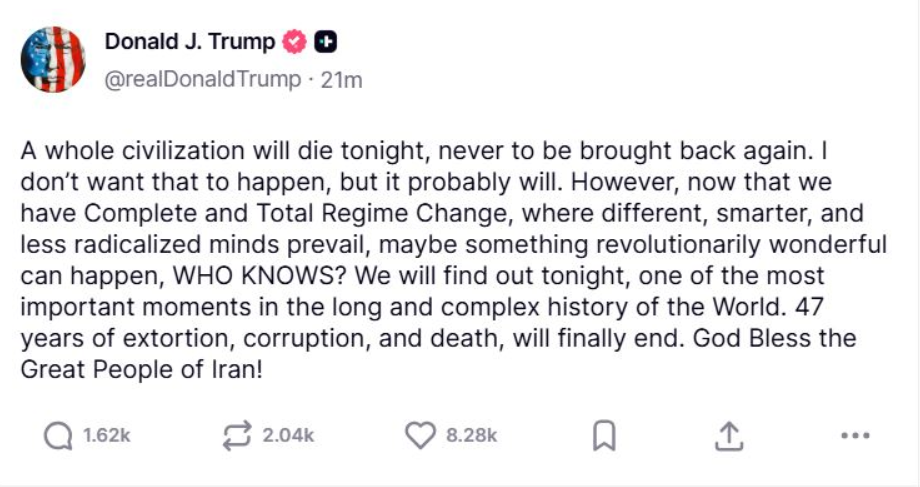 El a scris, pe platforma sa Truth Social, că „o întreagă civilizație va muri în seara asta, și nu va mai fi readusă niciodată la viață”.