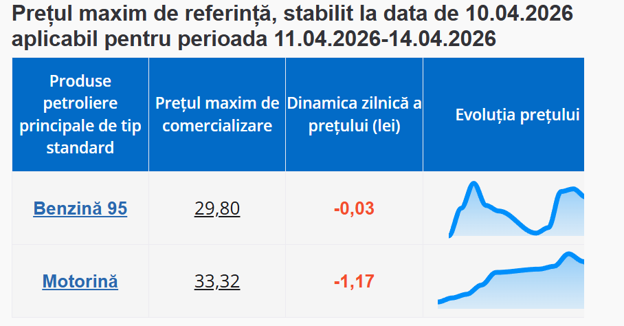 Astfel, conform datelor publicate de Agenția Națională pentru Reglementare în Energetică, în perioada 11 – 14 aprilie, litrul de benzină va costa 29,80 lei, cu 3 bani mai puțin decât astăzi. Totodată, prețul motorinei va scădea cu 1,17 lei, ajungând la 33,32 lei/litru.