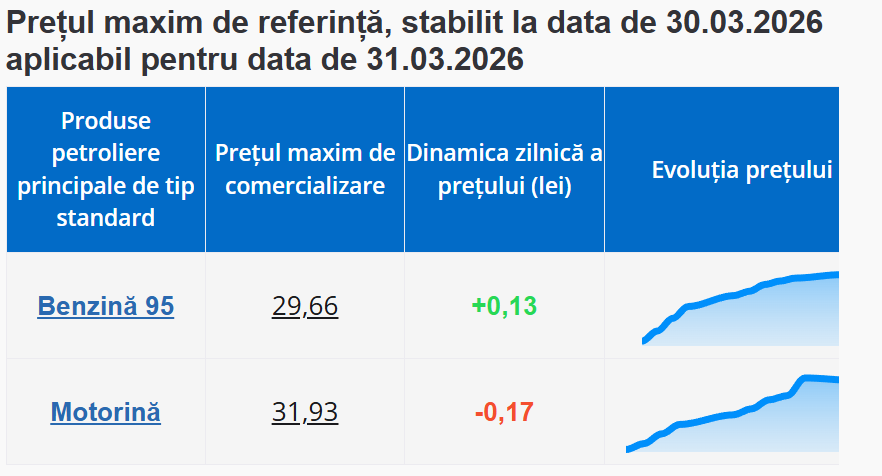 Agenția Națională pentru Reglementare în Energetică (ANRE) a afișat noile prețuri la carburanți pentru marți, 31 martie.