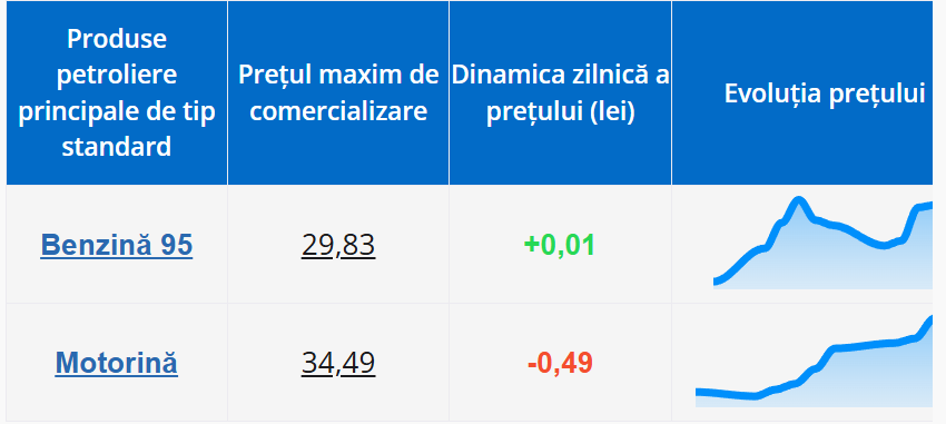 Astfel, litrul de benzină va costa 29,66 lei, cu 1 ban mai mult decât astăzi. Totodată, motorina se va ieftini cu 49 bani, urmând a fi comercializată cu prețul de 34,49 de lei/litru.