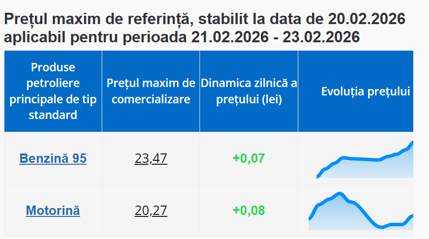 Conform datelor publicate de Agenția Națională pentru Reglementare în Energetică, în perioada 21-23 februarie, litrul de benzină va costa 23,47 lei, cu 7 bani mai mult decât astăzi. De asemenea, prețul motorinei va crește cu 8 bani, ajungând la 20,27 lei/litru.