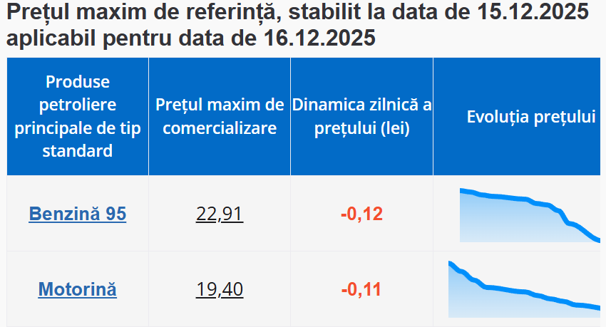 Astfel, litrul de benzină va costa 22,91 lei, cu 12 bani mai puțin decât astăzi. De asemenea, prețul motorinei va scădea cu 11 de bani, ajungând la 19,40 lei/litru.