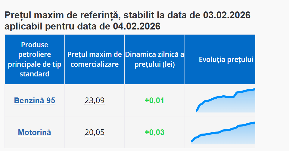 Agenția Națională pentru Reglementare în Energetică (ANRE) a afișat noile prețuri la carburanți pentru miercuri, 4 februarie.