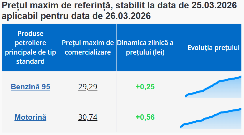 Agenția Națională pentru Reglementare în Energetică (ANRE) a afișat noile prețuri la carburanți pentru joi, 26 martie.