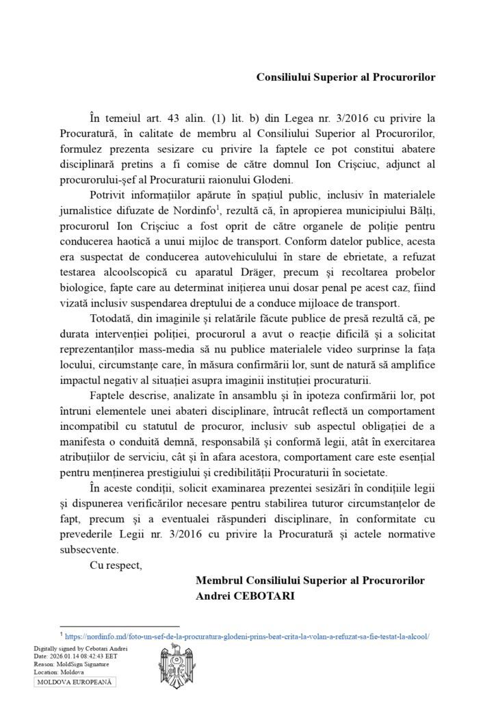 Șeful-adjunct al Procuraturii raionului Glodeni, Ion Crișciuc, riscă să fie sancționat disciplinar, după ce a fost prins beat la volan lângă Bălți. Membrul Consiliului Superior al Procurorilor (CSP), Andrei Cebotari, a anunțat că s-a autosesizat din oficiu în legătură cu informațiile apărute în presă.