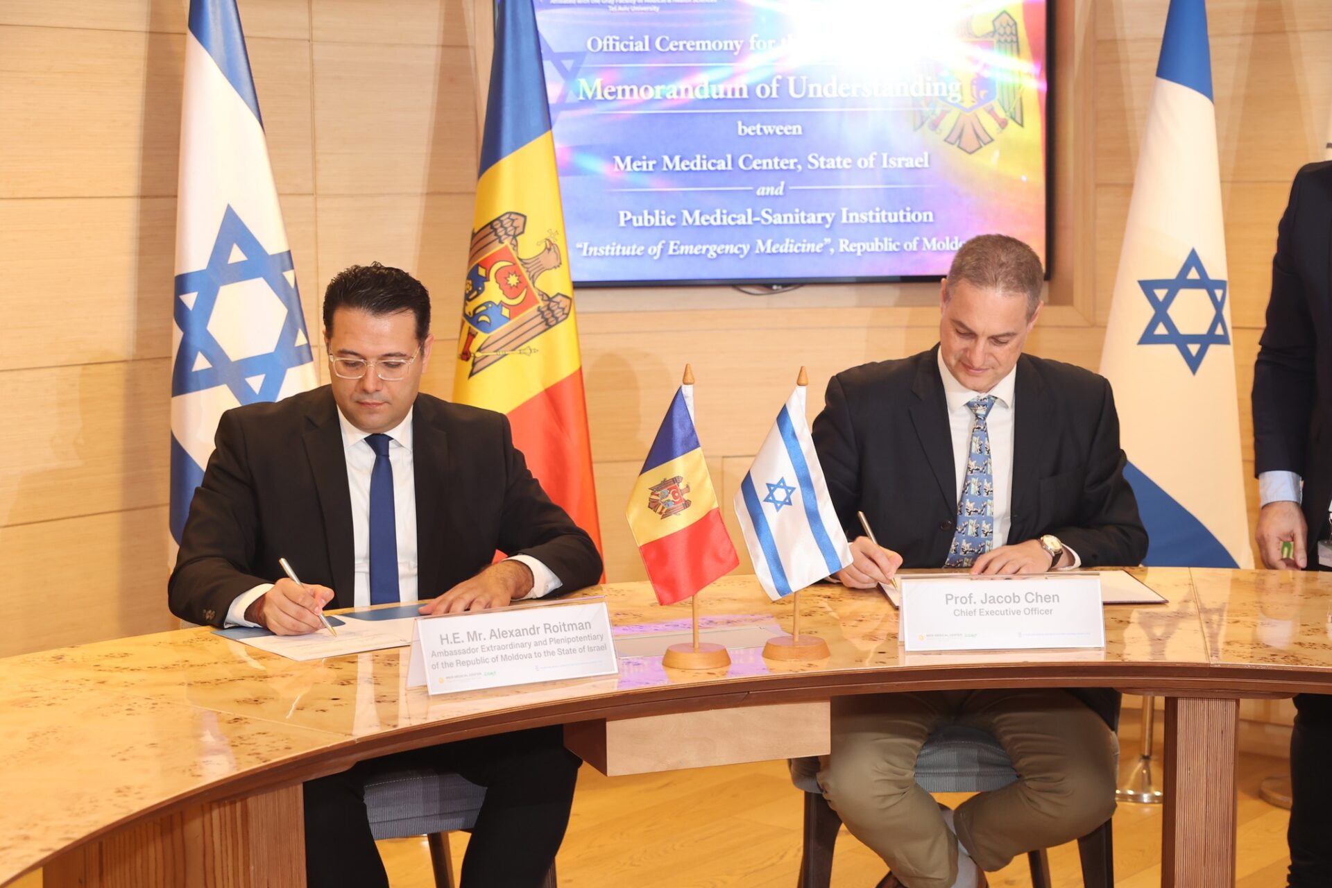 Documentul a fost semnat astăzi, 9 februarie 2026, la Kfar Saba, de către directorul Centrului Medical Meir, profesorul Jacob Chen, și ambasadorul Republicii Moldova în Israel, Alexandr Roitman, în numele Institutului de Medicină Urgentă.