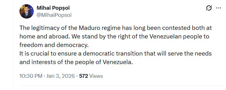 Republica Moldova își exprimă sprijinul pentru dreptul poporului venezuelean la libertate și democrație. Într-o postare publicată pe platforma X, ministrul Afacerilor Externe, Mihai Popșoi, a declarat că legitimitatea regimului condus de Nicolas Maduro este contestată de mult timp, atât pe plan intern, cât și la nivel internațional.