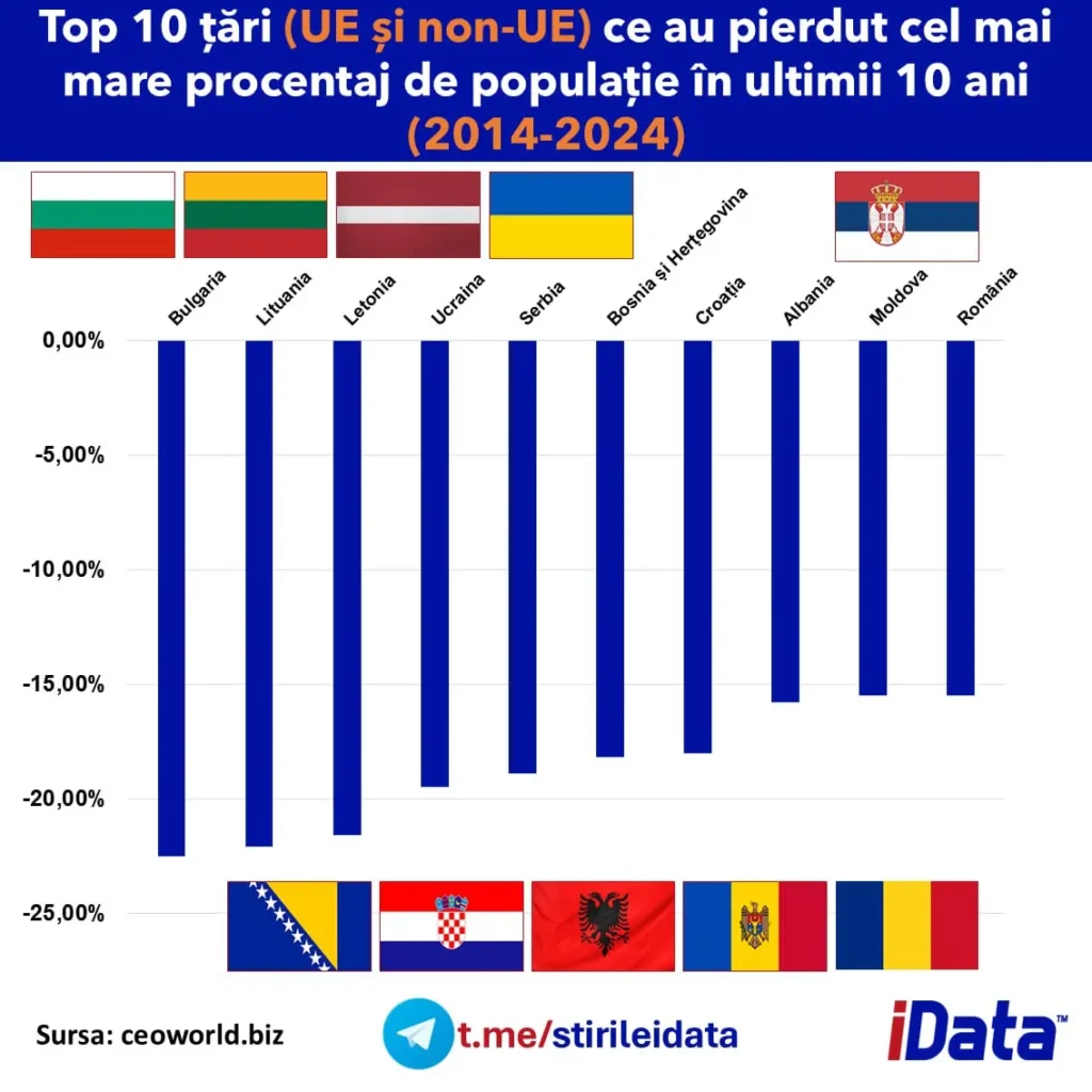 Între 2014 și 2024, populația Moldovei a scăzut cu 15,5%, plasând țara pe locul 9 în clasamentul global, alături de România.