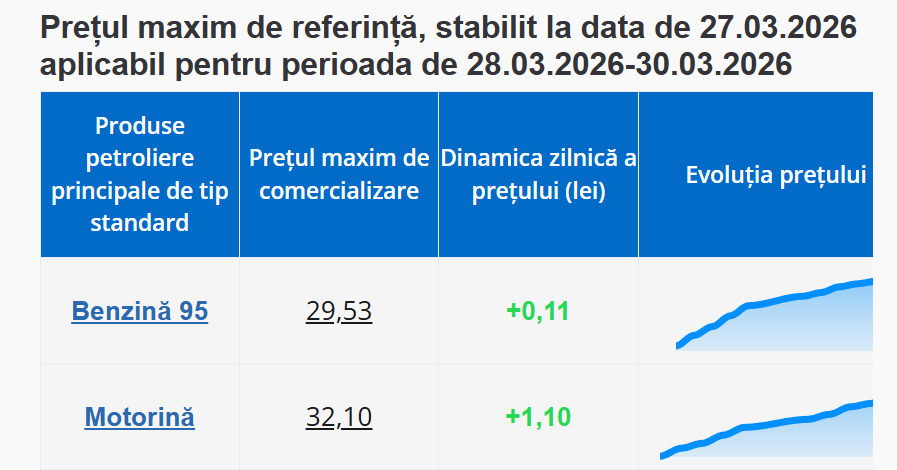 Conform datelor publicate de Agenția Națională pentru Reglementare în Energetică, în perioada 28 – 30 martie, litrul de benzină va costa 29,53 lei, cu 11 de bani mai mult decât astăzi. Totodată, prețul motorinei va crește cu 1 leu și 10 bani, ajungând la 32,10 lei/litru.